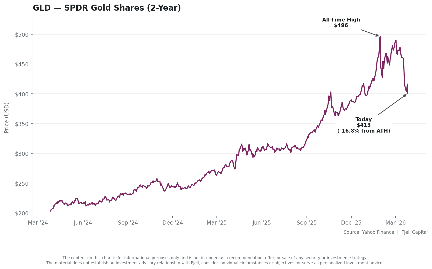 The chart below shows the SPDR Gold Shares ETF (GLD)'s price over the past two years, including the run to its all-time high and the current pullback.