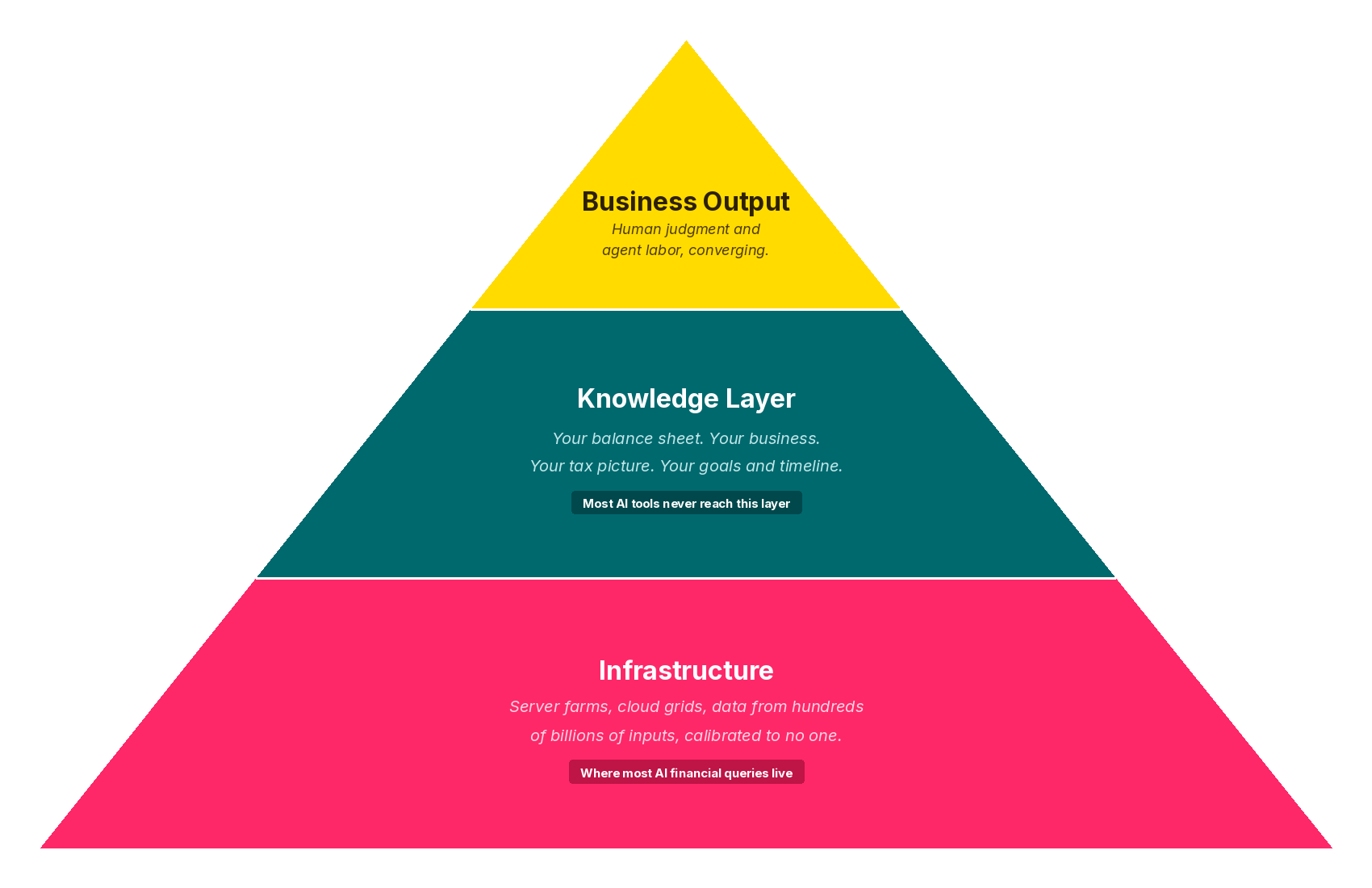 This diagram is something I shared with clients at our last quarterly review. Look at the layers. Infrastructure at the bottom. Knowledge layer in the middle. Business output at the top, where human and agent labor converge. Most people accessing AI for financial decisions are touching the bottom layer only. The knowledge layer, the one that would actually know their life, doesn't exist for them. And they can't tell the difference, because the output sounds so good.